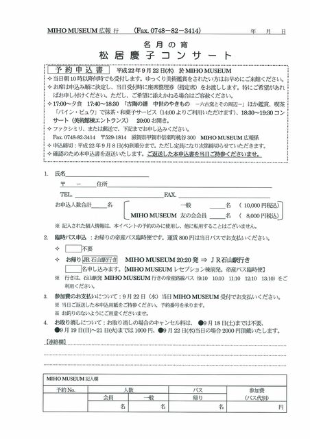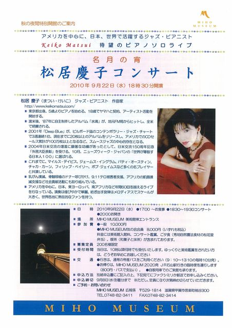 2010年 9月22日(水) 10:00 MIHO Museum OPEN 14:00 喫茶利用可 17:00 食事 18:30-19:30 コンサート 20:00 イベント終了 参加料金:10000円 (美術館入場料、コンサート代金、弁当&喫茶とお茶菓子を含む) FAXか郵送で申込んでください。 参加費は当日会場受付にて支払い。 〆切9月8日。お問い合わせは美術館広報課まで。 「MIHO Museum」 〒529-1814 滋賀県甲賀市信楽町桃谷300 TEL: 0748-82-3411 FAX: 0748-82-3414 http://www.miho.or.jp/japanese/index.htm JR東海道本線「石山駅」下車 バス 50分 信楽高原鐵