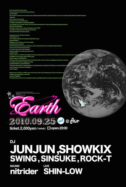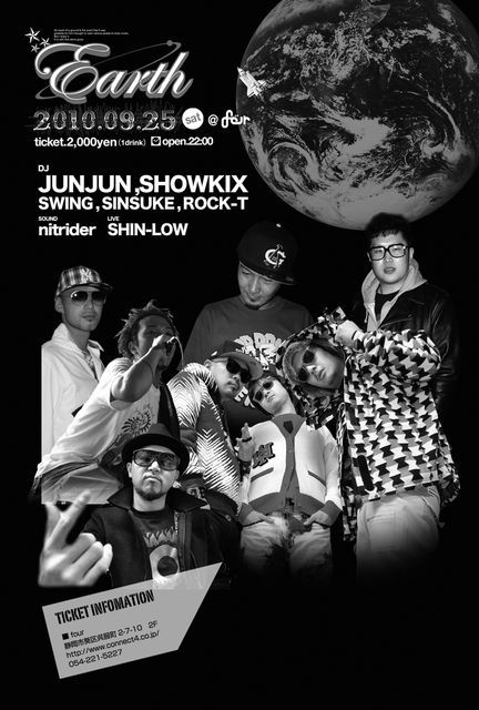 9月25日(土) Earth@four ticket 2000yen(1d) open 22:00 ●DJ JUNJUN SHOWKIX SWING SINSUKE ROCK-T ●SOUND nitrider ●LIVE SHIN-LOW