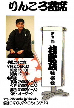 ☆9月25日(土) 《第三回桂歌蔵独演会》 開場 18:00 開演 19:00 予約 \2500 当日 \3000 ペア \4000 RINCOLOホムペ http://98.xmbs.jp/rincolo/ RINCOLOコミュ http://m.mixi.jp/view_community.pl?id=3475838& 予約はメッセでお気軽に〜♪