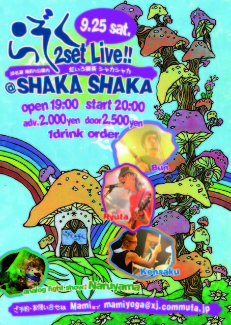 管理人さま告知お願いします 今年も浜松にてらぞくのライブ!! 会場「シャカシャカ」は浜名湖沿い公園の敷地内にあるカフェ 窓からは浜名湖が見わたせます。 一歩外に出れば湖の風に吹かれ、隣のビーチまでのんびり散歩も楽しめますよ。 そして、今回はNARUくんのOHPアナログライトショーあり!! ぐ〜〜るぐるになること間違いなしです。 楽しみだなぁ… 2010/9/25(土)静岡県湖西市 浜名湖 海釣り公園内 虹いろ喫茶 シャカシャカ OPEN/START 19:00/20:00 CHRAGE ADV/DOOR \2,000/\2,500(1drink order) ◆L