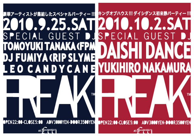 告知失礼致します。 スペシャルゲストに活動15周年のFPM! RIP SLYMEからDJ FUMIYA! 東狂エレクトロからLEO!DIMNA! (10.2.SATはDAISHI DANCE!!!) albino13からカメラマンでKT!VJでCHUN参加! FREAK™ 2010年9月25日(土) 会場:ETTI / 開場:22:00 / 前売:3000円-当日:3500円 ★SPECIAL GUEST ・TOMOYUKI TANAKA(FPM) ・DJ FUMIYA(RIP SLYME) ・LEO CANDYCANE・DINMA DJ: KSK / MAATEA / OOSUMIX / DJ PUKU / KENKEN / KOUSUKE OSADA VJ: CHUN PHOTOGRAPHER: KT ■TICKET ※好評発売中!!! ・ETTI: 054-254-7
