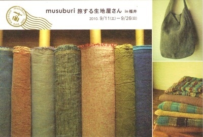 待ちに待ったmusuburiの生地屋さんが東京から福井に旅します。 9月11日(土)から9月26日(日)迄開催です。 11,12日には作家さんも来福されます。 musuburi(ムスブリ)とはテキスタイルブランドです。 奄美大島の昔の方言で『結ぶ』を意味する言葉です。 生地の染色は、奄美大島の泥染め、 草木染め、藍染、竹炭染め、土染めなどの天然染色です。 オリジナル生地をお探しの方、きっとご希望の生地が見つかりますよ! もちろん、私店主お勧めの手織りストールもやってきます。 横糸にたくさんの色をお使いになるのがとても素敵、 そして