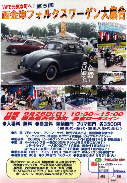以下主催者様告知より http://www.lotosinn.com/event/event.html ・日時 平成22年9月26日(日) 雨天決行 10:30〜15:00 ・場所 福島県 西会津町温泉健康保養センター 「ロータスイン」 福島県西会津町振興公社では、「フォルクスワーゲンで地域の活性化を」と考え西会津フォルクスワーゲン大集合というイベントを実施しています。フォルクスワーゲンに乗っている仲間で集まって、名物を食べたり、温泉に入ったり、情報交換をしたりのんびり楽しい一日を過ごしていただきたいと考えとおります。