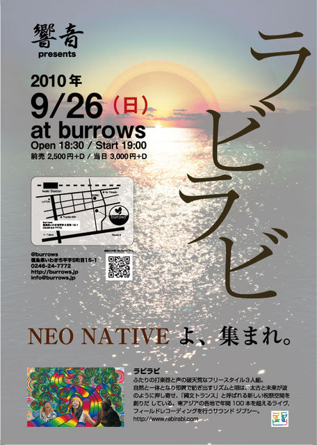 「響音」presents ラビラビ ふたりの打楽器と声の破天荒なフリースタイル3人組。 自然と一体となり即興で紡ぎ出す音と唄は、太古と未 来が波のように押し寄せ、「縄文トランス」と呼ばれ る新しい祝祭空間を創りだしている。東アジアの各地 で年間100本を超えるライヴ,フィールドレコーディン グを行うサウンド ジプシー。 2010年9月26日(日曜日)OPEN18:30/START19:00 前売2500円+D/当日3000円+D 出演 ラビラビ お問い合わせ バロウズいわき 0246-24-7772 info@burrows.jp