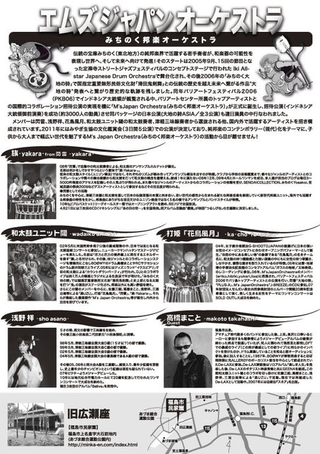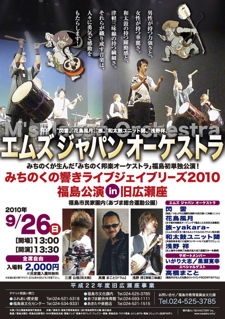 浅野祥や閃雷によるみちのく邦楽オーケストラ M's Japan Orchestraの福島公演が決定しました。 今回は国指定重要文化財での演奏で、ゲストに 福島県出身の元BOOWYのドラマー高橋まこと氏 を迎え行われます! 福島の皆さん是非遊びにきて下さい。 ●M's Japan Orchestra みちのくの響きLIVE J-BREEZE 2010 福島公演 in 旧廣瀬座 ■日時/2010.9.26 ■時間/開場13:00 開演13:30 ■料金[全席自由]2000円 ■チケットプレイガイド ●福島市文化課 TEL024-525-3785 ●ふれあい歴史館 TEL024-521-5318 ●あづま総合体育
