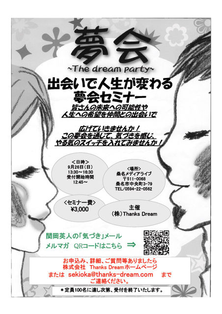 2010年プレゼンターの関岡さんが ドリームプランプレゼンテーションでご案内した『夢会』の開催案内です。 この機会にふるってご参加ください また、ご興味ある方へお知らせいただけると幸いです ★セミナーのお知らせ【9月26日開催】 出会いで人生が変わる! 「夢会」セミナーのお申込み受付中!! レジメ↓ http://thanks-dream.com/pdf/yumekai2010.pdf 参加希望の方は↓ http://thanks-dream.com/company/contact.html ヒデさんの会社『株式会社サンクスドリーム』↓ http://thanks-dream.com/
