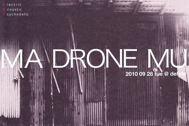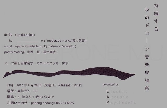 "MA DRONE MU" (持続する秋のドローン音楽収穫祭) 日時:2010年9月28日(火曜日) 21時より1時54分まで @表町 "delete" 料金:500円(ハーブ茶と自家製オーガニッククッキー付き) dj:鈴 (undia / tiloli) ho_______________wa (moderado music / 音人音響) visual:esquina (minha feliz / dj matsunoo & ongaku) poetry reading:中西 亘 (富士商店) お問い合わせ:padang padang 086-223-6665