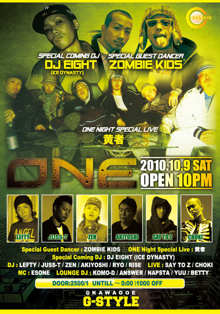 管理人様告知失礼いたします! 毎回大盛況のEVENTです! 今回のONEは川越G-Styleの7周年の第2週ということでSpecial Guest Dancerに現在大活躍中のZOMBIE KIDS!! さらにONE Night Special Liveに黄者!! そしてSpecial Coming DJにはICE DYNASTYよりDJ EIGHTを迎えて開催します!! ONE@川越G-Style 2010/10/9(Sat) DOOR:2500/1D 24:00までにお越しの方は1500/1D! [Special Guest Dancer] ZOMBIE KIDS [ONE Night Special Live] 黄者 [Special Coming DJ] DJ EIGHT (ICE DYNASTY) [FLOOR DJ's] LEFTY JUSS-T ZEN