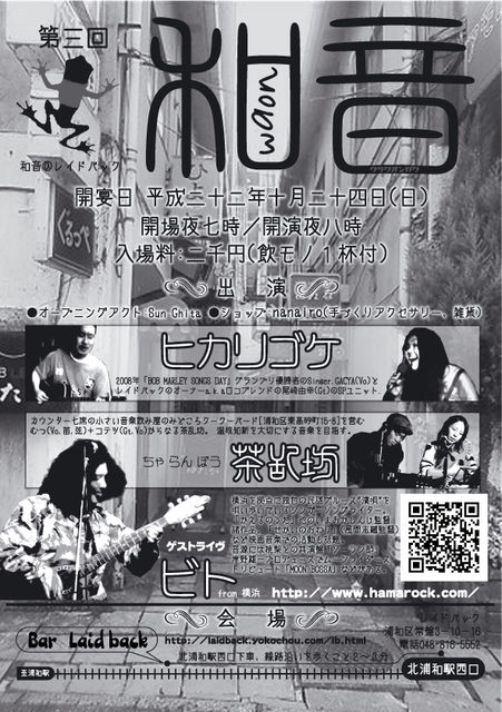 第三回「和音」開催のお知らせです。 ■和音-waon- Vol.3 日時:2010/10/24(Sun.) OPEN:19:00 START:20:00 FEE:2000yen(1dつき) ◆OPENING ACT:Sun Ghita ◇LIVE: ◆ヒカリゴケ(Vo. Gacya , Gt. 尾崎由幸) ※参考:http://ameblo.jp/gacya-p/ ◆茶乱坊(Vo.&笛や弦 ムツ, Gt.&Vo. コテツ) ※参考:http://blog.goo.ne.jp/tyarannbou ◇GUEST LIVE: ◆ビト(Vo.&Gt.)from横浜 ※参考:http://hamarock.com/ ◇SHOP:nanairo かわいい手づくりアクセサリー、雑貨 場所:Bar LaidBack(北浦和) 埼玉県さいた