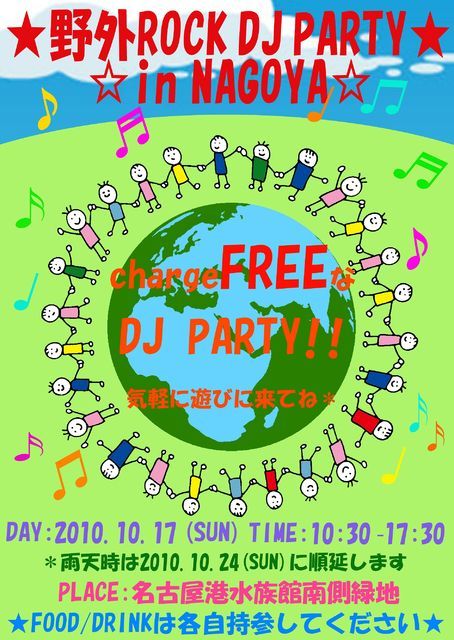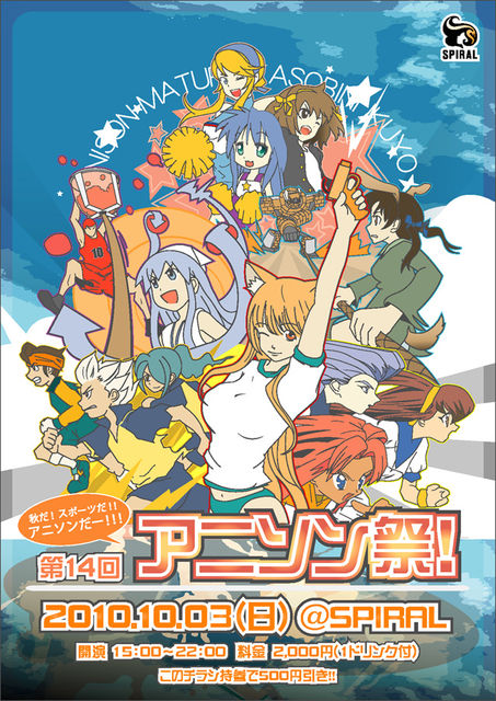 第14回 アニソン祭! 〜秋だ!スポーツだ!!アニソンだー!!!〜 開催日 : 2010年10月3日(日) 会場 : SPIRAL (名古屋市中区栄3丁目32-6 BECOME SAKAE 6F パルコの隣) 時間 : 15:00〜22:00 料金 : 2,000円(1ドリンク付) ←チラシ持参orチラシ画像提示で500円引きだよ! DJ : むらさき、デジモリオ、ォ銀、T.G.R、すもち、ヤマザル VJ : サキサカユガミ、stoれーじ イラスト: coba 備考 : コスプレ歓迎!(でも更衣室はありません><) ※コスプレでの来場はご遠慮