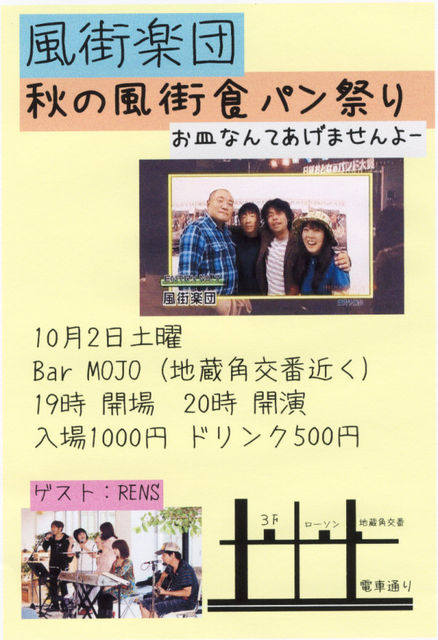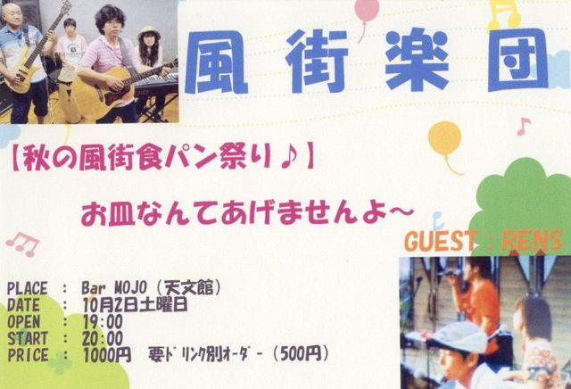 【秋の風街食パン祭り♪】 お皿なんてあげませんよ〜 PLACE : Bar MOJO(天文館) http://mixi.jp/view_community.pl?id=1021937 DATE : 10月2日土曜日 OPEN : 19時半 START : 20時 PRICE : 1000円 要ドリンク別オーダー(500円) そして今回は、ゲストにRENSのみなさんをお迎えします http://ameblo.jp/rens/entry-10652122590.html