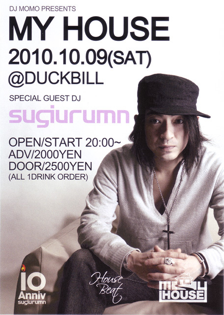 管理人様、告知失礼します。 みなさん御存知、sugiurumn ワタクシ、サポートDJします。 前売りはグッチまで よろしくお願い致します。 2010/10/9 sat 「MY HOUSE」@Duckbill DJ MOMO PRESENTS <SPECIAL GUEST DJ>sugiurumn ■OPEN/START 20:00 ◆ADV:2000yen / DOOR:2500yen [ALL 1DRINK ORDER] <RESIDENT DJ>MOMO <SUPPORT DJ>TAKUMI (GANDHARA) / MANYON (METROPOLICE) / HISAJIMA / KENBO (WELLE,gothic) / SHIOTA / UTO / YAMA-Q / グッチ (FLAVOR) <PERFORM