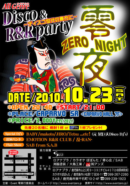 ☆EVENT名 Diaco 零夜 ★日程 10月23日(土) ★会場 CAPARVO SR (7F) ★open 20:40 ★start 21:00 ★ticket 3,000円(2D付) 先着20名様に 焼酎 or ZIMAプレゼント ★Special Dj's BABY / makoto JIRO / Tetsu 。。。ほか! ★出演バンド EMOTION R&R CLUB 乱 ★Flair Show SAB from S.A.B ★取扱い店 ロアナプラ 鹿児島市山之口町9−39 ニチビル407 (小田原病院前) カラオケ ぽぽんた 鹿児島市小松原1丁目36-11 099-267-2260 S.A.B 鹿児島市東千