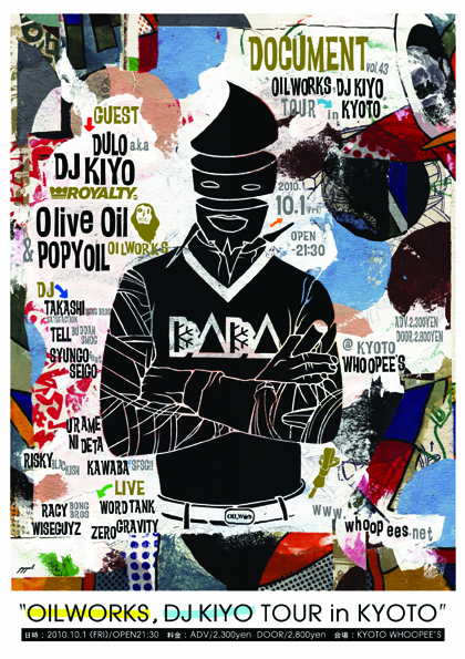 今宵! 良質、良音、良いBEAT、秋の京都で酔いしれる夜。 GOOD VIBES溢れるGOOD TIMES。 是非。 2010.10.1.fri "DOCUMENT" @KYOTO WHOOPEE'S 075-551-2331 www.whoopees.net OPEN-21:30 ADV.2,300YEN / DOOR.2,800YEN ■GUEST■ DULO a.k.a DJ KIYO (ROYALTY PRODUCTION) OILVE OIL (OIL WORKS) / POPY OIL (OIL WORKS) ■DJ■ TAKASHI(BONG BROS/SATISFACTION) TELL(BUDDAH SMOG) SYUNGO feat.SEIGO URAME NI DETA KAWABA(SFSG!!) NINE ■LIVE■ RACY(BONG BROS/KCYB) WORD TANK WISEGU