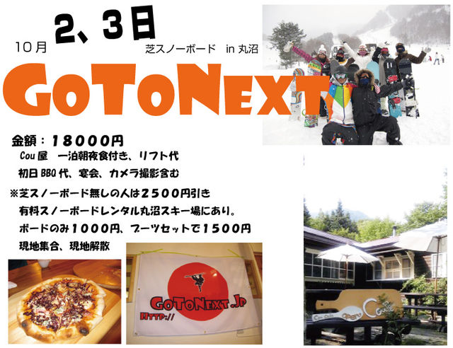 GoToNextスノーボードキャンプ in 丸沼 October 冬まで待ちきれない!! ☆空の下での芝スノーボード&バーベキューキャンプ☆ 意外と面白い芝生ボード&バーベキューをやることになりました! 一緒に滑ってBBQーーーーーーーーーーーー(^ ^)/仲間もたくさん増えますよ♪ 開催日 2010年10月2日(土)〜3日(日) ゲレンデ 丸沼高原スキ ー場 宿 丸沼高原の森の中にある石窯cafeと宿 ピザがほんとにーおいしくてアットホームで親切で素敵なご夫婦オーナーの宿です。Cou屋 旅行代金 18,000円 含むもの 1泊朝夕食、初日