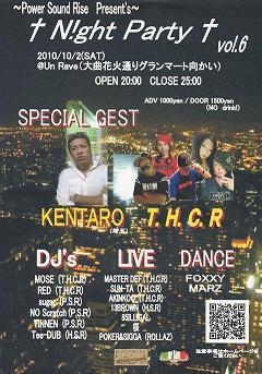 2010/10/02(SAT) †N!ght Party†vol.6 @Un Reve (大曲花火通りグランマート迎え) OPEN 20:00〜CLOSE 25:00 ADV\1000yen(100枚限定) ※当日先着50名様に1Dサービス付きます。早めのご来場をオススメ致します。 50名を越えた時点で1Dサービスを終了させて頂きます DOOR\1500yen(No Drink) 〜Special Guest〜 ・【KENTARO】[埼玉] ・【T.H.C.R】[DJ MOSE、DJ RED、SUN-TA、MASTER DEF、AKINKOO] ◆DJ's◆ MOSE[T.H.C.R] RED[T.H.C.R] Tee-DUB[H.S.R] No Scratch[P.S.R] Sugar[P.S.R] T!NNEN[P.S.R] ◆LIVE◆ SUN-TA