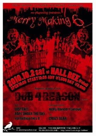 DUB 4 REASON 1st ALBUM “WICKEDUB”release tour m-planning presents Merry Making 6 ADV ¥1,500 DOOR ¥2,000 DUB 4 REASON (from:Gifu) LASTCALL RAPE UNDER THE SKY vermillion lies Ω Opening Show:Belly Dancer Tomoyo DJ: CRAZY BEAR INFO : m_planning@yahoo.co.jp HALL BEE : 〒910-0006 福井市中央1丁目6-4 東ビル1F TEL:090-2033-6781(中条) http://www15.ocn.ne.jp/~hallbee/