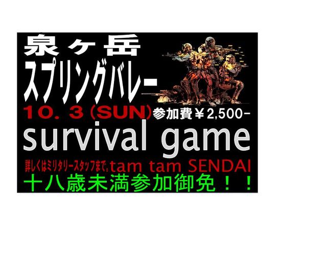 タムタム主催のサバゲーイベントがあるみたいです。 かなり、ざっくりしたマニュアルが店頭にありました。 ベーム内容は、 ・フラッグ戦 ・せん滅戦 ・衛生兵戦 チームは、当日、現地で分けるみたいです。 興味あるかたいますか? とりあえず、ご報告。