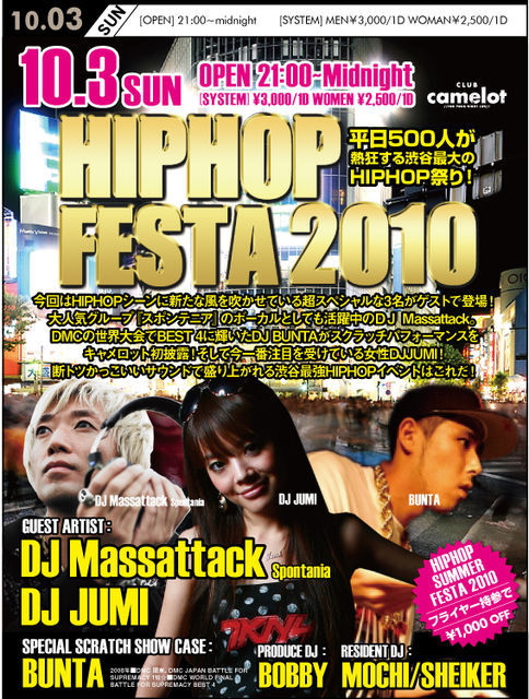 管理人様、書き込み失礼致します 。 毎回革新的な内容かつ多彩なGUESTを招き、 日曜日の渋谷の歴史を塗り替えてきた -HIP HOP,R&B PARTY- HIP HOP FESTA 2010 今回は、 10月3日の日曜日(21:00-5:00)に渋谷キャメロットにて開催されます 10月のSPECIAL GUESTには、あのJUJUとの楽曲 『君のすべてに』などで人気絶大 SPONTANIA(スポンテニア)がキャメロット初登場 サプライズ・ゲストも来ちゃうかもしれませんよ〜!! GUEST DJには、BENIのバックDJもこなし、その抜群のルッ