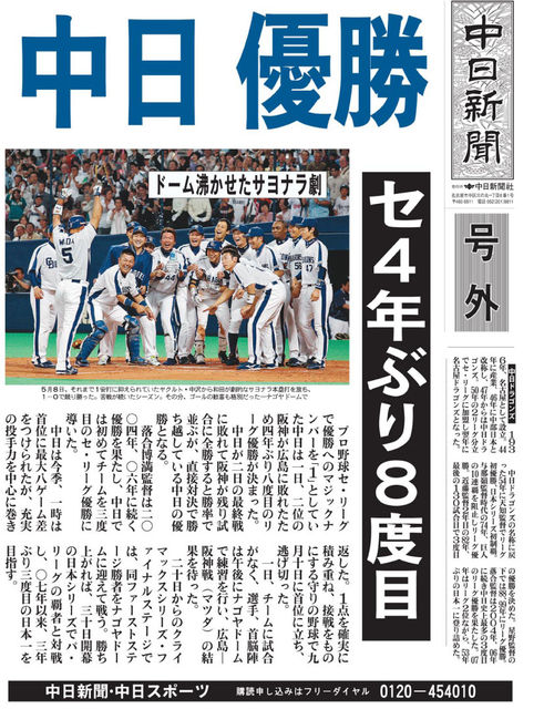 中日ドラゴンズ セントラルリーグ制覇!!! 優勝です!! 先日雑談トピでも予告させていただいたようにドラゴンズがセリーグ優勝を決めましたので 関西のドラゴンズファン大集合で優勝祝賀会を開催したいと思います。 皆様このコミュ以外のドラゴンズファンの友達もお誘いの上大いに盛り上がりましょう!! 日時:10月3日日曜日 15時スタート 第1部15時〜18時、第2部18時〜21時 場所:お手盛り酒場やっとい亭 大阪府 大阪市北区 西天満6-8-14 06-6362-8005 http://ggyao.usen.com/0004011247/ 会費:各部1000円(