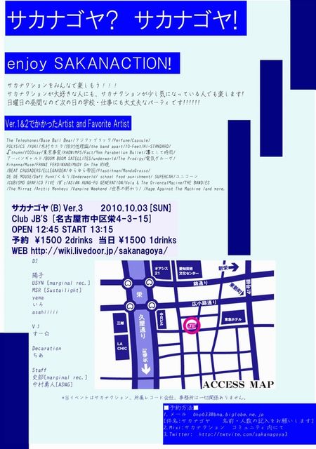 管理人様、失礼いたします。 名古屋で行うサカナクションのDJイベント サカナゴヤ(B) が前回 http://mixi.jp/view_event.pl?id=51359126&comm_id=209792 大好評で終わることが出来ましたので 早速第3弾を開催できることになりました! 今回は武道館直前の日曜日 10月3日日曜日におこないます。 場所は今回もサカナクションが「GO TO THE FUTURE」レコ発ツアーを行った JB'sで行うことになりました。 どこのサカナイベントよりも大きな音&高音質で楽しめると思います