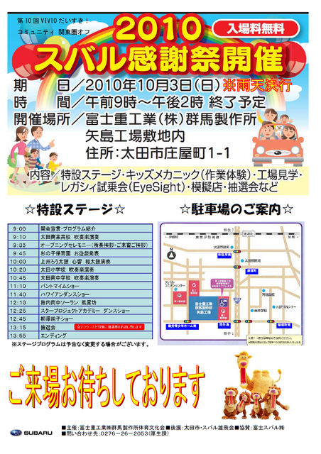 一年の沈黙を破りついに復活!スバル感謝祭便乗オフ開催を宣言します!! ■開催日時:2010年10月3日(日) 午前9時集合、9時30分に移動を開始 ■集合場所 スバル運動公園駐車場 群馬県邑楽郡大泉町いずみ1丁目3086 http://map.yahoo.co.jp/pl?p=%B7%B2%C7%CF%B8%A9%CD%B8%B3%DA%B7%B4%C2%E7%C0%F4%C4%AE%BE%EB%C7%B7%C6%E25-5-1&lat=36.26012667&lon=139.41099833&type=&ei=euc-jp&sc=3&gov=10524.9.5.2.1 ベイシア大泉店(群馬県邑楽郡大泉町城之内5-5-1)が隣ですので目印、ナビの到着先として指定すると良いと思います。 ■待ち合