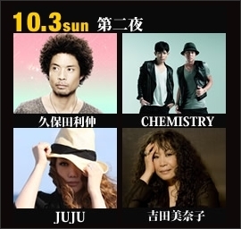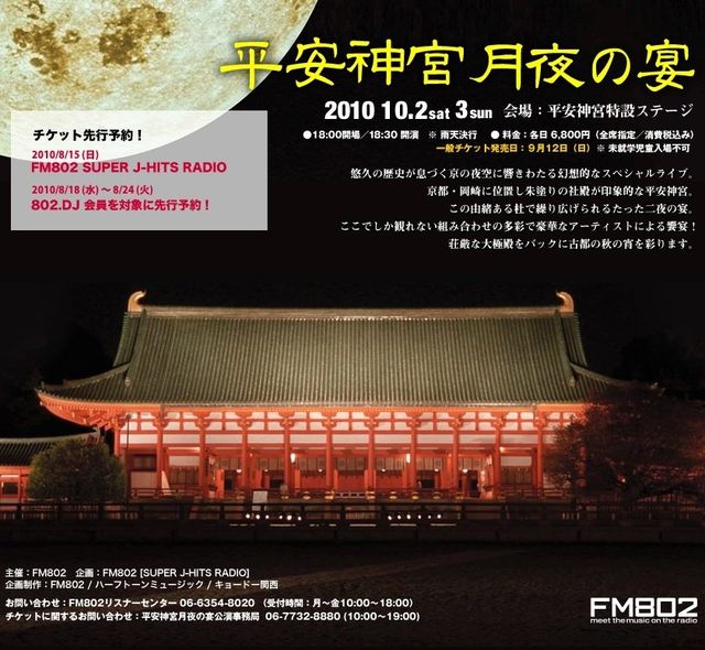 平安神宮月夜の宴 悠々の歴史が息づく 京の夜空に響きわたるスペシャルLIVE CHEMISTRY 久保田利伸 JUJU 吉田美奈子 問合せ先 平安神宮月夜の宴公演事務局 06-7732-8880 (無休/10:00〜19:00)