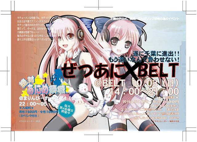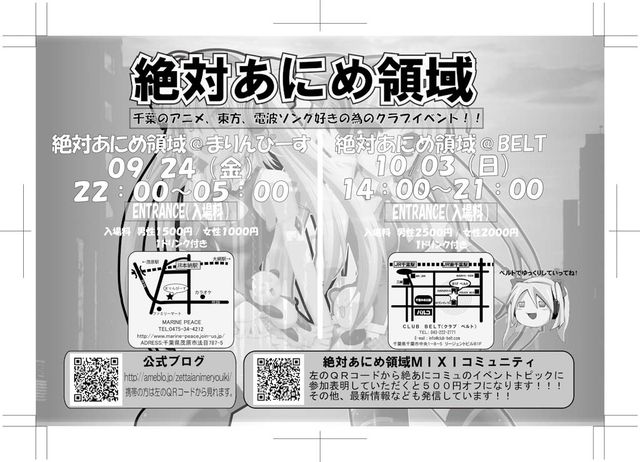 普段のぜつあにがちょっと遠いと思っている人!お待たせいたしました! ついに絶対あにめ領域が千葉に進出です!! コスプレ大歓迎(男女別の簡易更衣室あります。)!ヲタ芸OK!そしてデイイベントなので中、高校生もOK!! アニメをあまり知らない方も映像と共に曲がかかるので楽しんでいただけます!! ○○○○○○○○○○○○○○○○○○○○○○○○○○○○○○○○○○○○○○○○○○ 千葉唯一のアニソンイベント!!絶対あにめ領域。ただの人間には興味ありません。この中にアニヲタ、ガンヲタ、東方厨、ニコ厨、エロゲ