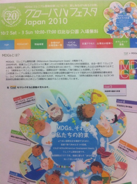 2010年10月2日(土)・3日(日)10:00〜17:00 場所:東京・日比谷公園 参加団体:援助関連政府機関・公益法人、大使館、NGO団体関連等 約250団体 参加団体やスケジュール等の詳細は、日程が近くなったらホームページで確認できます。 http://www.gfjapan.com/ 去年の様子は、このコミュの去年のトピックにレポートしています。 http://mixi.jp/view_bbs.pl?id=46784817&comm_id=373658 世界各国の食べ物を食べたり、企画を見たり、一人で行っても楽しくて、ためになるイベントです 多くのボランティアが参加し、商品の売上金