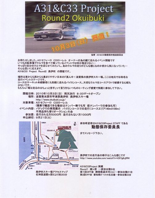 9月21日にて参加締め切りいたしました。 皆様のご協力ありがとうございます。 もし出産、身内の不幸、海外出張、疾病等で締切日までにやむを得ず申し込めなかった方が見えましたらご一報下さい。 参加台数 A31…18台 C33…15台 計33台です。 参加者の皆様、当日はよろしくお願いいたします。