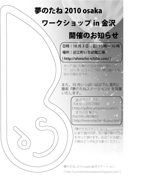 夢のたねワークショップin金沢を開催します。 近江町いちば館広場にて、10時〜16時。 集まったたねは大阪で進行中の「夢のたね2010 osaka」へ送られます。 2008年の金沢21世紀美術館でのプロジェクトに参加された方はぜひ! http://yumetane.com/ http://yumetanekanazawa.blogspot.com/