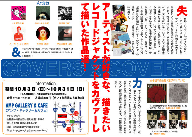 告知宜しくお願いします! *10月<アートを訪ねる月>参加イベントです。 【展示名】COVERS x COVERS 【作 家】 *恒松正敏(東京) *YABU / 薮直樹(福岡) *大串亮平(佐賀) *アートホーリーメン(熊本) *北島敬明(佐賀) *木村明子(東京) *コジマアミゾク(福岡) *ソエジ (佐賀) *RIMO(佐賀) *マツモトマサヒデ(熊本) *赤星幸子(熊本) *塩月 悠(佐賀) *江柳 (大分) 【期 間】 2010 年 10月3日(日)~31日(日) 【時 間】 12:00〜1
