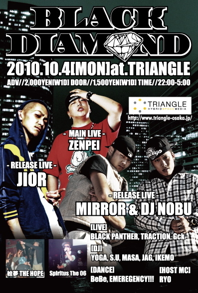 毎月第一月曜日開催!! 2007年3月〜スタート! 平日月曜日にも関わらず、毎回反響を呼んでいる【BLACK DIAMOND】 RESIDENTSには大阪を中心に活躍するDJ,MC,DANCERが数多く出演! WEEKDAY No.1 PARTY... それが、BLACK DIAMOND!!!! ★☆★☆★☆mixi特典★☆★☆★☆★ 入り口にて「mixiを見た」と言うと入場料ディスカウントされますので、どうぞお使い下さい♪ ★☆★☆★☆mixi特典★☆★☆★☆★ 10/4 (MON) BLACK DIAMOND@Triangle ADV / 2000YEN(W1D) DOOR / 1500YEN (W1D) OPEN / 22:00