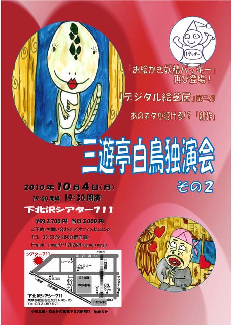 ぴかぴか(新しい)白鳥独演会その2のお知らせですぴかぴか(新しい) 〜普段は出来ない特別なこと〜 やってくれてますexclamation ×2 前回誕生したパッキーはどんな成長を見せてくれるのか!? デジタル絵芝居も第二弾制作進行中!! 何卒よろしくお願い致しますわーい(嬉しい顔) 三遊亭白鳥独演会 日時:10月4日(月)19:00開場、19:30開演 場所:下北沢シアター711 料金:予約2,700円 当日3,000円(全席自由席) ご予約・お問い合わせ misa-071202@true.ocn.ne.jp ご予約お待ちしております\(^o^)/ 下北沢シアター711 http://www.honda-ge