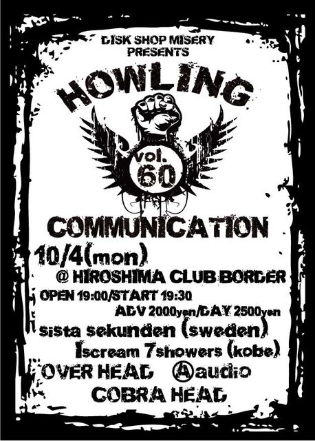 ■10月4日@広島CLUBボーダー -HOWLING COMMUNICATION vol.60- sista sekunden (sweden) Iscream 7showers (kobe) OVERHEAD COBRAHEAD @audio ADV 2000円/DAY 2500円(1drinkオーダー) OPEN 19:00/START 19:30 チケットぴあ:Pコード 117-668 ミザリー PUNK/HARDCORE強化月間 in OCTOBER 其の一!! 今回のゲストはINTENSITY、SKITKIDS、SATANIC SURFERSなどのメンバーによるSWEDEN産HARDCORE PUNKバンド、sista sekunden(シスタ・セクンデン)が広島初来襲!!スピーディーなHARDCOREサウンドにメロディアスな部分も持ち合わせたキ