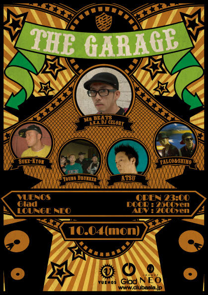 管理人様、告知失礼致します。 毎月第一月曜にVUENOS, Glad, NEOの3店舗連動で行われているBIG PARTY、 「THE GARAGE」の日が今月もやってまいりました 週始めの月曜日から毎回600人近い人で溢れる、平日屈指の満員御礼イベント RESIDENT GUEST DJのMr.BEATS a.k.a.DJ CELORYを筆頭に 各フロア豪華メンツで楽しんでいただけること間違いなし しかも三店舗同時開催は、平日でこのイベントだけです 是非遊びにいらして下さい メッセージを戴ければ通常は\2500/1Dのところを ゲスト料金の\10