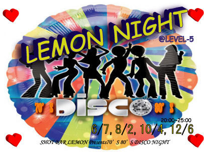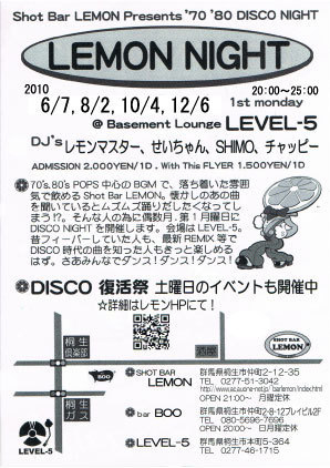 管理人様、告知を失礼致します。 来たる10月4日(月)に偶数月恒例のDISCOイベント 「LEMON NIGHT」を開催します DISCOをタイムリーで感じていた方々も、 DISCOに興味がある若者もみんな一緒になって楽しめるイベントです 場所は桐生市LEVEL−5 スタートはPM8時からです DJ's レモンマスター、せいちゃん、SHIMO、チャッピー 料金:2000円(1ドリンク付き) 1500円(1ドリンク付き)With FLYER です。 季節はそろそろ秋です みん