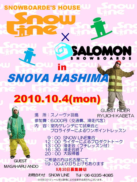 皆さんお元気ですかァ いつもHOUSEではオフシーズン毎週のように羽島滑走会を行っており いつもたくさんの方達に参加して頂きホントにありがとうございますm(__)m しかァしッ 今回開催される滑走会ではあのSALOMONとSNOWLINEのイナズマコラボセッションとなります GUEST MASAHARU ANDO(アンドゥ) GUEST PRO RIDER RYUICHI KABETA(スクローバのカベチャン) をお迎えしみん