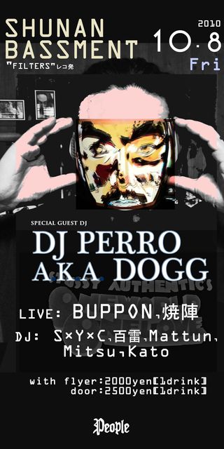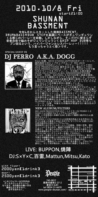 管理人様告知します。 ◆◆◆◆◆◆◆◆◆◆◆◆◆◆◆◆◆◆◆◆◆◆◆◆◆◆◆◆◆◆◆◆◆◆◆◆◆◆◆ 周南BASSMENT塾! 10月8日金曜日 山口県周南市@PEOPLE マンスリーに山口県、PEOPLEにて開催される、D&B,HIP HOP,JUNGLE,DUB STEP,CUMBIA,ectがブン回るパーレーっす。 今月は一年ぶりにあのお方が山口に来ます。しかも、前回は野外でしたが、今回は箱です。HIP HOP全開レス。 では、ではでは。 北からの刺客。言わずと知れた。Mic Jack Productionからこのお方 ●DJ PERRO a.k.a. DOGG from MIC JACK PR
