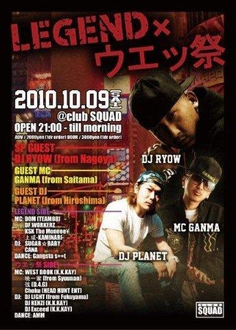 告知失礼します。 不適切でしたら削除願います。 『LEGEND × ウェッ祭!!』 2010.10.9(SAT) @CLUB SQUAD(岩国) <山口県岩国市麻里布町3-1-19 シンセイビルB1F> OPEN21:00 CLOSE5:00 ADV \2000 DAY \3000 (WITH 1DRINK ORDER) [Special Guest] DJ RYOW[名古屋] [GUEST] GANMA[埼玉] DJ PLANET[広島] LEGEND SIDE [DJ] DJ Suger Baby DJ CANA[周南] DJ 一休[周南] [MC] 上成 斬[HEAD HUNT ENT] DF workers KSK The Monee\ DOM[TEAM 88] [DANCE] Biatch!!!+BU$TA ウェッ祭!!SIDE [DJ]
