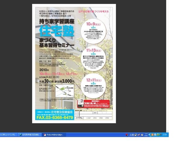 これからマイホームを考えたい、今の家を建て替えたい。 そのような方の気になる疑問を解消します。 講師は9/20(祝)FMナックファイブ内NACK ON TOWN13:00〜に 住宅コンサルタントとしてゲスト出演予定のベテラン講師です!! 講師は生まれも育ちも川越。ということで、川越の皆さんには 良い住まい、納得の行く家づくりをして欲しいということで、 このミクシィを見て受講申込みメールを頂いた方には 計3回シリーズのセミナー1回分を無料で受講OKとなりました☆ セミナー事体の定員は30名です。 日時:第1回目 10/9(土) 第