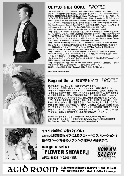 10/09(sat) 「H.H.H - HAPPY HOUSE HOUR 〜cargo × seira『FLOWER SHOWER』 Release Party〜」 2010.10.9.Sat @札幌 ACID ROOM(http://www.acidroom.jp) OPEN 21:00 前売り ¥2,000 DAY ¥2,500 ※入場時1drink購入していただきます ローソンチケットLコード:13950 GUEST LIVE ■加賀美 セイラ GUEST DJ ■cargo a.k.a GOKU ■DJ SHIMAYA SHO/ HOJYO/ISHIKAWA/MORICH/ MOJA/4LA/NOB ■VJ&DJ MORICH