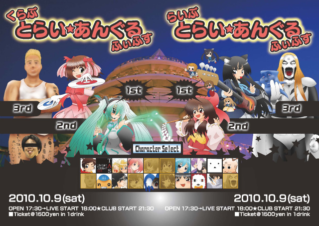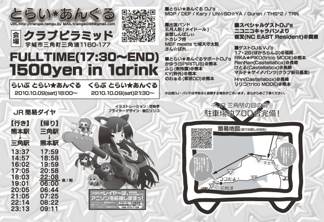 とらい★あんぐる ふぃふすは毎年10月恒例のバンドイベントとクラブイベントの融合です! 今回はニコニコキャラバンよりスペシャルゲスト DJ夜叉 を迎えての12時間ぶっ通しのイベントだ! ちょっと冷え込んできたここ最近ですが、10月9日のクラブピラミッドは灼熱Beach side bunny! 10/9 18:00 〜 10/10 06:00? FULL TIME 1,500円@1D付 クラブピラミッド@熊本県宇城市三角町三角浦1160-177 会場地図 http://plazz.me/~6CyB バンド (18:00〜21:00予定) 五月人形(メイドール) 妄想しんぱしぃ トカレフ侍 MEF さん★