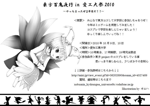 さぁて、今年もやってまいりました! 愛知工業大学、学校祭!! いやぁ、一年って長いようで短いですね! 今年もやっちゃおうぜ、コスプレ百鬼夜行!!って事で立てちゃいました! 今年は2日間開催しちゃいますよ!! 日時: 10月9日(土)、10日(日) 場所: 愛知工業大学 アクセス: リニモの終点、八草駅から徒歩orシャトルバス 愛知環状線の八草駅から徒歩orシャトルバス 自家用車でもおk 内容: 東方のコスプレをして、学祭に参加しようぜ!! ジャンルは東方オンリー! 定員: 50人 参加費: 無