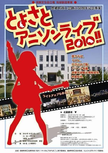 けいおん!の聖地旧豊郷小学校校舎群にて、豊郷町商工会主催のアニソンライブを開催します。 本日よりmixiからのエントリーも可能となりました。 抽選ではなく先着順となりますので、 定員に達し次第募集を締め切らせていただきます。ご了承下さい。 入場料は無料です! けいおん!が好きな方、アニソンが好きな方は 是非一緒にライブを楽しみましょう♪ なお、参加される方には「とよさと特製巡礼うちわ」をプレゼントします!! そして夜には豊小のライトアップも予定しています!! ■日時 2010年10月9日(土) 14:30〜17:30