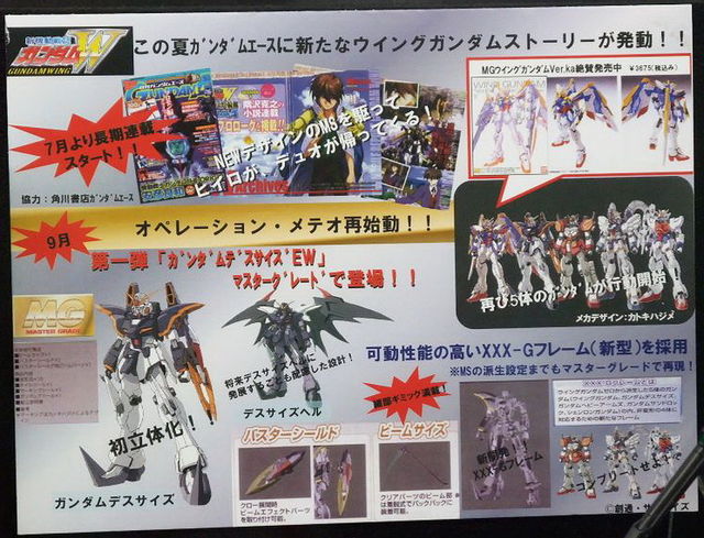 ご無沙汰しております、マソーです。 第一回ガンダムWオフから早いもので、一年半が過ぎました。 今年放映15周年の記念年になる為か、続編や新規プラモデル展開などの動きがあるようです。 特に続編の「新機動戦記ガンダムW Frozen Teardrop 無言の前奏曲」は個人的に展開が超気になるところです!! せっかくの記念年なので、語らう場を設けたいと思い、会を企画いたしました。 ご都合がよろしければぜひ、ご参加下さい。 主催としては新作やMS、おかしなセリフ回しについて語りたいのですが、キャラ萌えでもG-UNITでも右手に鎌を…に