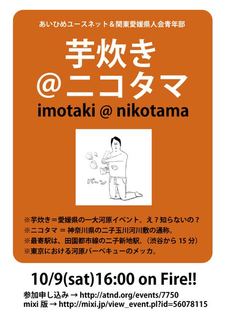 二子玉川の河川敷で、芋炊きやるよ。 あーつまれ〜 愛媛県出身者、大歓迎。 愛媛県が好き、大歓迎。 郷土料理好き、大歓迎。 ↓mixi登録者以外の方用に、ATNDでも募集しちょります http://atnd.org/events/7750 ----- 現在、参加者が30名弱になってます! 楽しみ〜〜〜!!! さて、会場までの地図ですが、こちらを参照↓ http://www.google.co.jp/maps/ms?ie=UTF8&hl=ja&msa=0&msid=100704343605628401033.000491eb4ae5bc2d7d2d1&ll=35.608119,139.624075&spn=0.003275,0.006775&z=18&brcurrent=3,0x34674e0fd77f192f:0xf54275