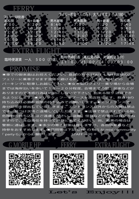 ◉車での御来島はお控えください。島民の方やSTAFFも機材運搬の為、フェリーに乗車させます混雑を避ける為、フェリー乗り場付
