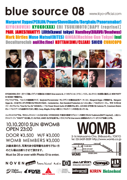 KIYO(NOVEN)がオーガナイズ兼レジデントを務める8回目のblue sourceは、3つのジャンル(テクノ、ハウス、エレクトロ)を良質に融合したNEW PARTYをWOMBで開催する。