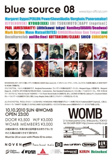 KIYO(NOVEN)がオーガナイズ兼レジデントを務める8回目のblue sourceは、3つのジャンル(テクノ、ハウス、エレクトロ)を良質に融合したNEW PARTYをWOMBで開催する。